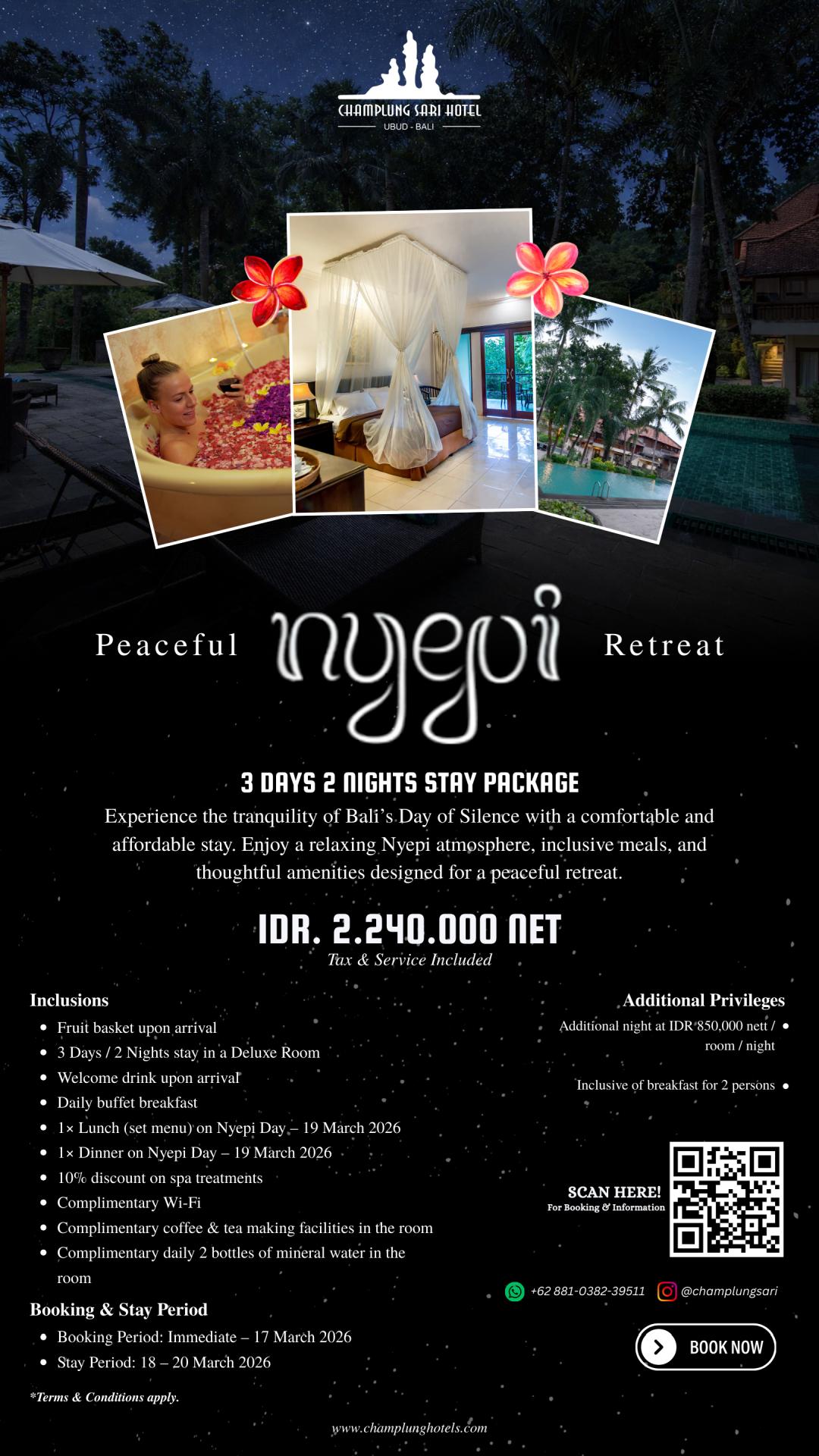 Champlung Sari Hotel is a restful retreat set within a green landscape at the edge of Ubud's sacred Monkey Forest Sanctuary. It is an environment that nurtures the senses with its tropical gardens that are crossed by two small rivers. Clusters of comfortably appointed guest rooms are scattered across the property in a style that recreates the ambiance of a traditional Balinese village.